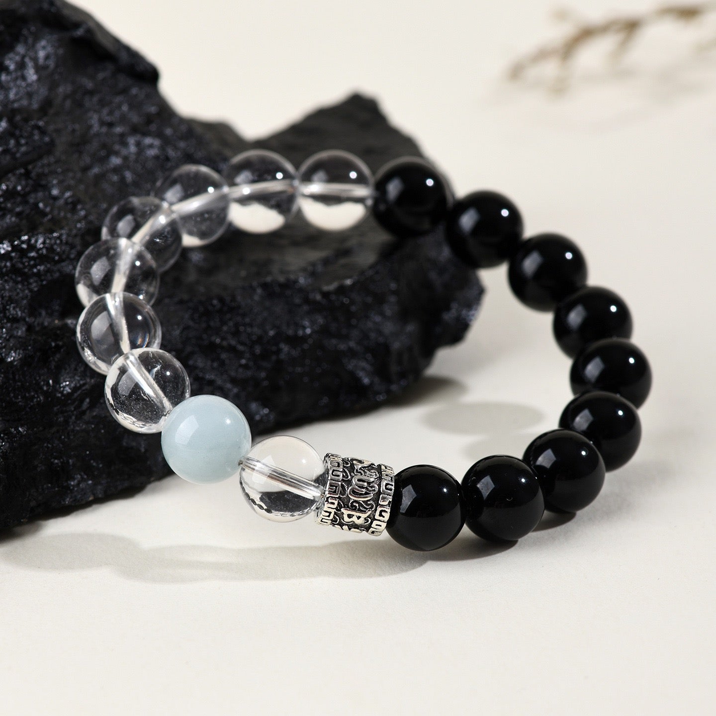 Find clarity, protection, and calm in one powerful design. The Clear Quartz Obsidian Balance Bracelet unites luminous white crystal and deep black obsidian in perfect harmony, accented with aquamarine and a sacred Six-Word Mantra bead.