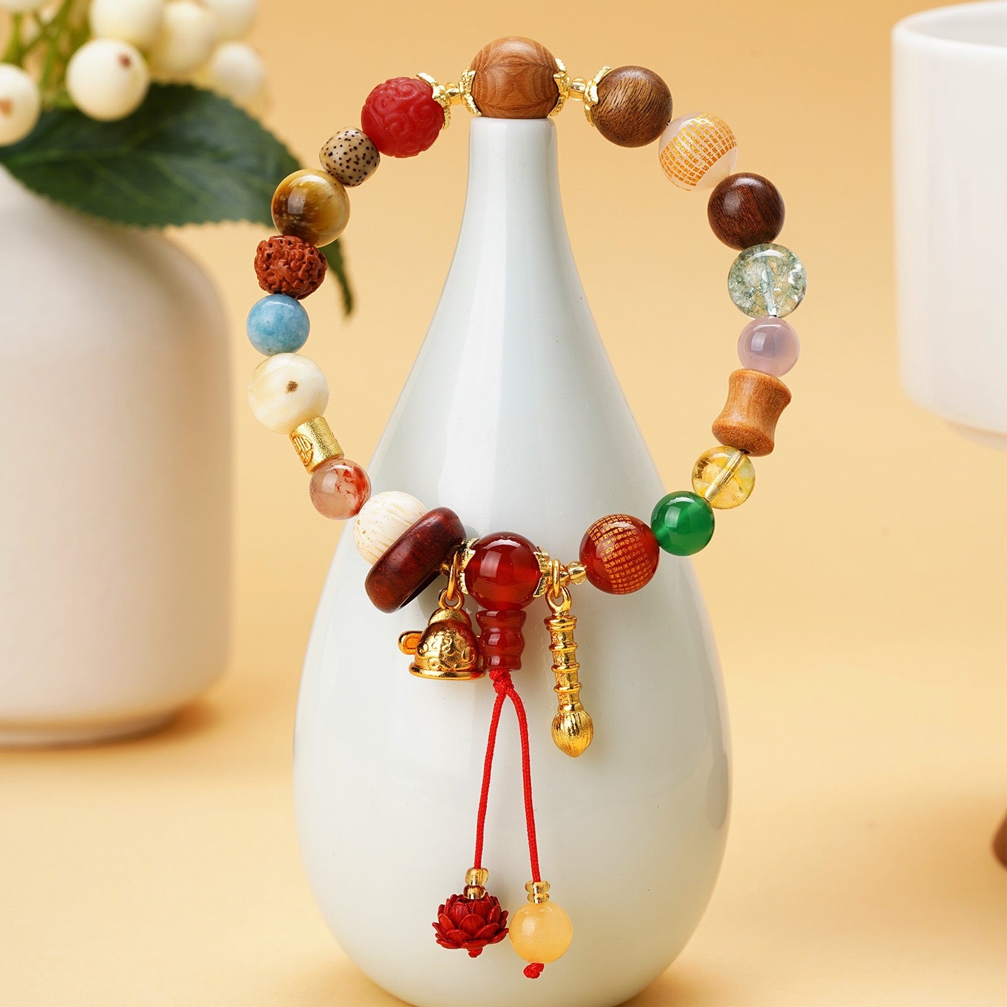 - Eighteen Natural Materials: Including red agate, tiger eye, citrine, agarwood, sandalwood, bodhi seeds, crystal, jade accents, and more