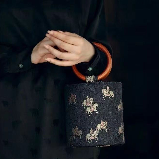 Embrace the fusion of tradition and elegance with our Ethnic style circular wooden handle Fortune Bucket Bag. Handcrafted from interwoven Song brocade, this exquisite piece embodies prosperity and cultural richness. Perfect for any occasion, it’s designed to carry your essentials while enhancing your spiritual journey.