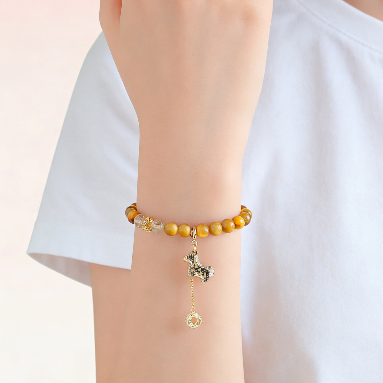 The golden horse charm adds dynamic motion to this bracelet. In Chinese symbolism, the horse represents progress, ambition, and rising luck. "马到成功" (success comes swiftly) is a common phrase tied to horse imagery—and this charm channels that very energy.
